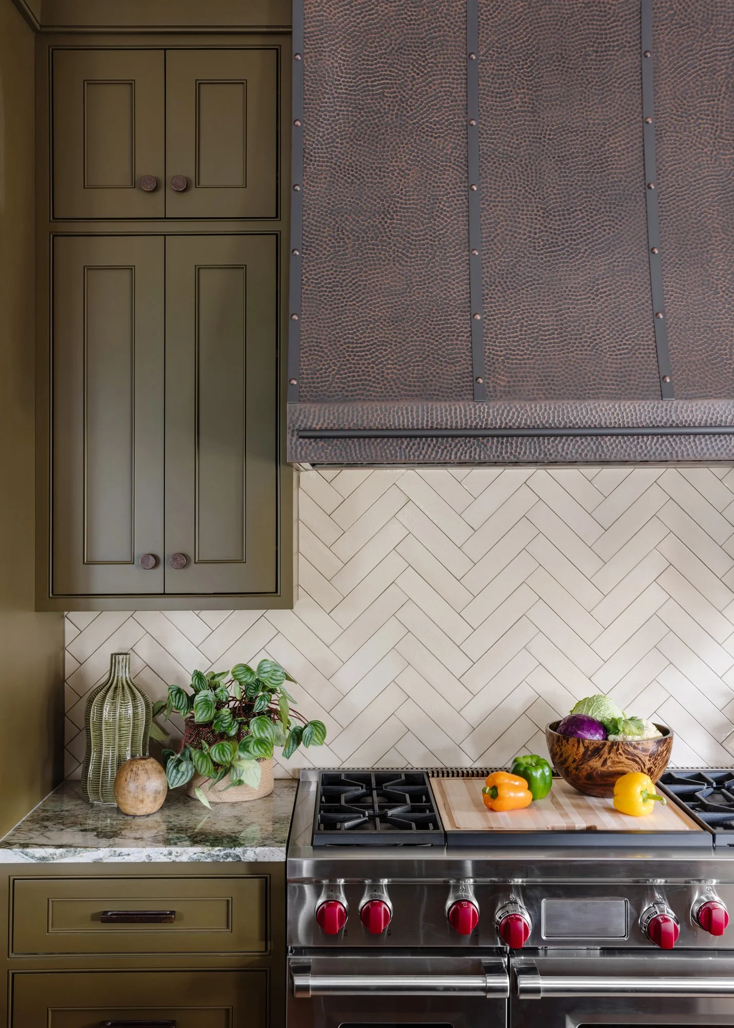 Originally, the homeowners envisioned a herringbone pattern for the pine floors. We decided to use that pattern in the tile backsplash and keep the flooring more simple. The copper finish in the hood is repeated in the cabinet hardware. I love the olive green cabinets, too! For this home, it feels timeless.